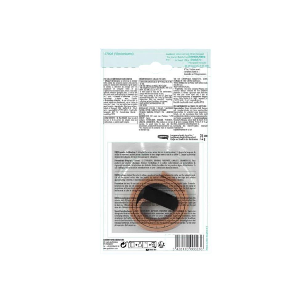 Vetocanis pretinsektu repelenta kakla siksna kaķēniem un jauniem kaķiem 35cm Pretinsektu repelenta kakla siksna ārīgai lietošanai kaķēniem un jauniem kaķiem no 3 mēnešu vecuma, satur dabīgas augu izcelsmes aktīvās vielas kuras atbaida ērces, blusas un odus. Saskarē ar ādu var izraisīt lokālu ādas reakciju. Kakla siksnas garums 35 cm. Lietošana: Lietošanai dzīvniekiem. Atveriet hermētisko iepakojumu tieši pirms izmantošanas, izņemiet no iepakojuma, lai nodrošinātu maksimālu efektu, uzlieciet kakla siksnu tā, lai starp siksnu un dzīvnieka kaklu būtu divu pirkstu atstarpe, atlikušo kaklasiksnu nogrieziet, atstājot 5 cm no fiksācijas vietas. PIESARDZĪBAS PASĀKUMI Nelietot slimiem un dzīvniekiem atveseļošanas periodā. Pēc pirmajām klīniskajām pazīmēm nekavējoties noņemiet kaklasiksnu. Glabāt bērniem nepieejamā vietā. Sastāvs: Margosa ekstrakts (CAS nr. 84696-25-3) 20g/L – 2 %, Lavanda (CAS nr. 91722-69) 15g/L– 1,5 %. Biocīdu klasifikātorā: insektu repelents PT19 Darbības ilgums ir 3 mēneši no atvēršanas brīža. Uzglabāt temperatūrā no 15-25 grādi. RAŽOŠANAS SĒR. UN IZLIETOT LĪDZ: skatīt uz iepakojuma. Ražots:ES, Francija IZPLATITĀJS: SIA „BERTAS NAMS”, Rīga, Ventspils iela 50, bar. Izpl. Nr. LV 019020, tel. 80000060