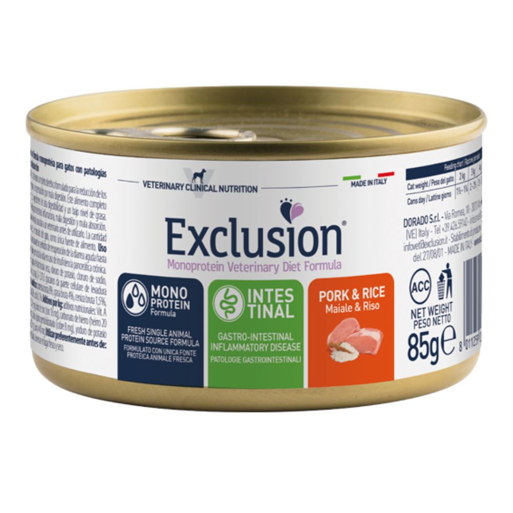 EXCL Intestinal konservi kaķiem ar cūkgaļu un rīsiem 85 g
